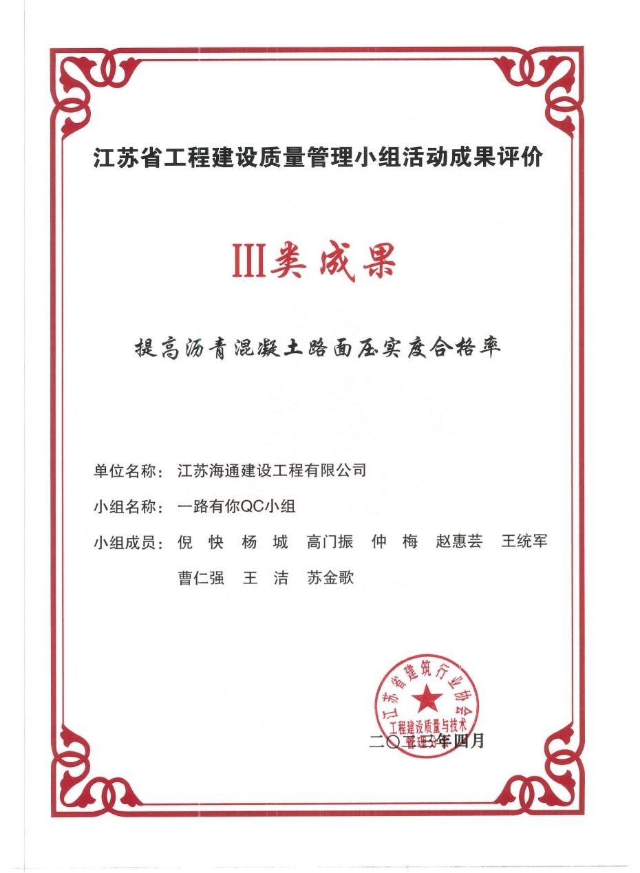 近日,從連云港市質(zhì)量協(xié)會獲悉,江蘇海建公司“一路有你”QC小組成果《提高瀝青混凝土路面壓實度合格率》榮獲江蘇省工程建設質(zhì)量管理小組活動成果評價三類成果獎。