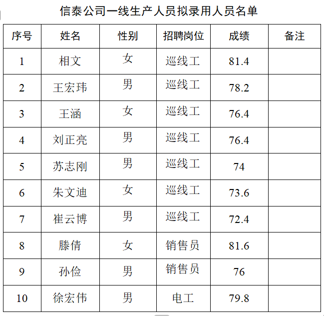根據(jù)江蘇信泰燃?xì)庥邢薰菊衅腹嬗嘘P(guān)規(guī)定和要求,現(xiàn)將本次招聘擬錄用人員名單予以公示。 公示時間:2025年3月21日至3月27日