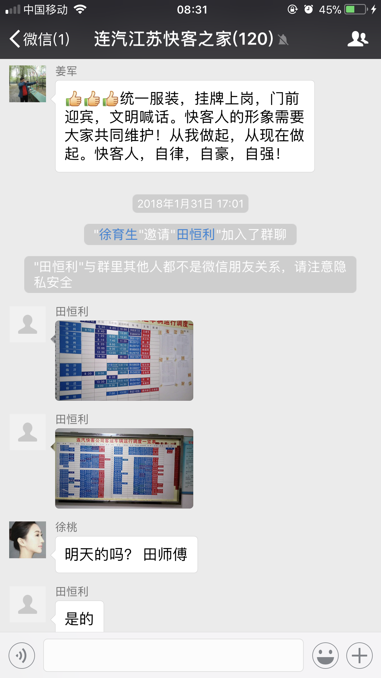 這是快客公司的員工微信群,每天各個(gè)科室會(huì)及時(shí)將春運(yùn)工作提示發(fā)布到微信群,并快速回答員工的詢問;發(fā)現(xiàn)各種的不良苗頭,第一時(shí)間發(fā)布出來,給大家提個(gè)醒;堅(jiān)持每天推出第二天的調(diào)度安排,讓駕駛員提前知道明天的行車計(jì)劃,將每個(gè)的閃光點(diǎn)通過照片展示出來,給堅(jiān)守一線的駕駛員打氣鼓勁,這是連汽快客公司運(yùn)用微信群在春運(yùn)期間的安全神器。