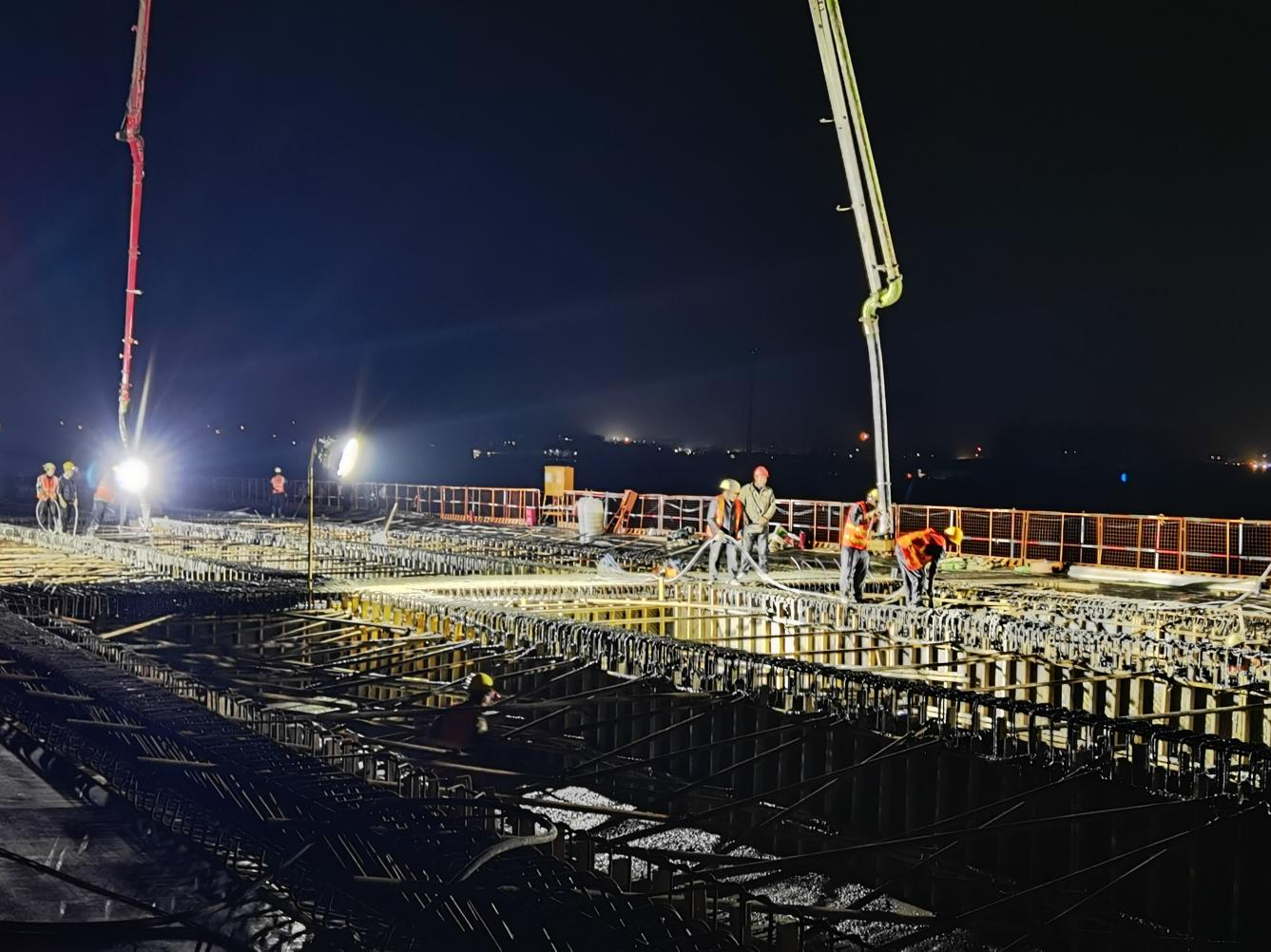 此次澆筑任務艱巨,挑戰(zhàn)重重。從前期的精心籌備到實際施工,每一個環(huán)節(jié)都凝聚著建設者們的智慧與汗水。施工現(xiàn)場,機器轟鳴,一片繁忙景象,施工人員們各司其職,緊密配合。技術人員時刻關注著澆筑過程中的每一個細節(jié),憑借著精湛的專業(yè)技能和豐富的經(jīng)驗及時解決出現(xiàn)的各種問題,確?;炷恋臐仓|(zhì)量和速度。