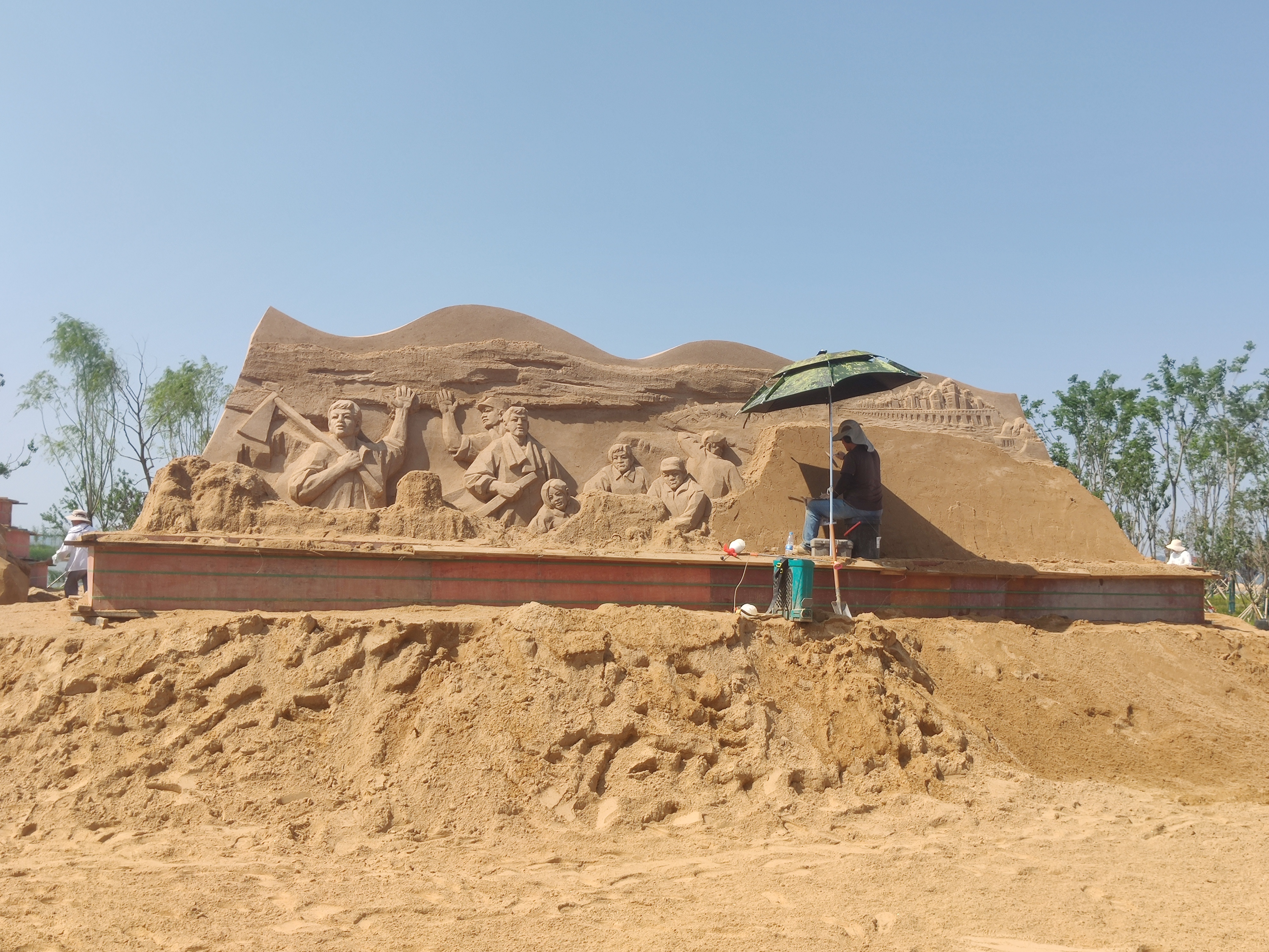 “黃金沙灘”圍繞“沙”的元素設(shè)置了“趣味沙世界”主題區(qū),打造七處主題沙雕,占地1100平方米,包括一個主雕塑和六處分雕塑,主雕塑為13米長、5米寬、3.6米高,分雕塑均為4米長、4米寬、3米高,七個雕塑共同構(gòu)成一個大型組合沙雕展覽區(qū)。大型組合沙雕展覽區(qū)的各個單位沙雕圍繞一個主題使沙雕作品具有較強(qiáng)的故事性和趣味性,增強(qiáng)作品的文化內(nèi)涵。同時,在組合沙雕上將設(shè)計與主題相協(xié)調(diào)的游覽路線,使游客可走進(jìn)沙雕,從各個角度觀賞,體驗(yàn)樂趣,將進(jìn)一步增強(qiáng)沙雕場景的真實(shí)性和藝術(shù)效果。目前各沙雕已頗具雛形,預(yù)計6月20日前完成全部沙雕雕刻。
