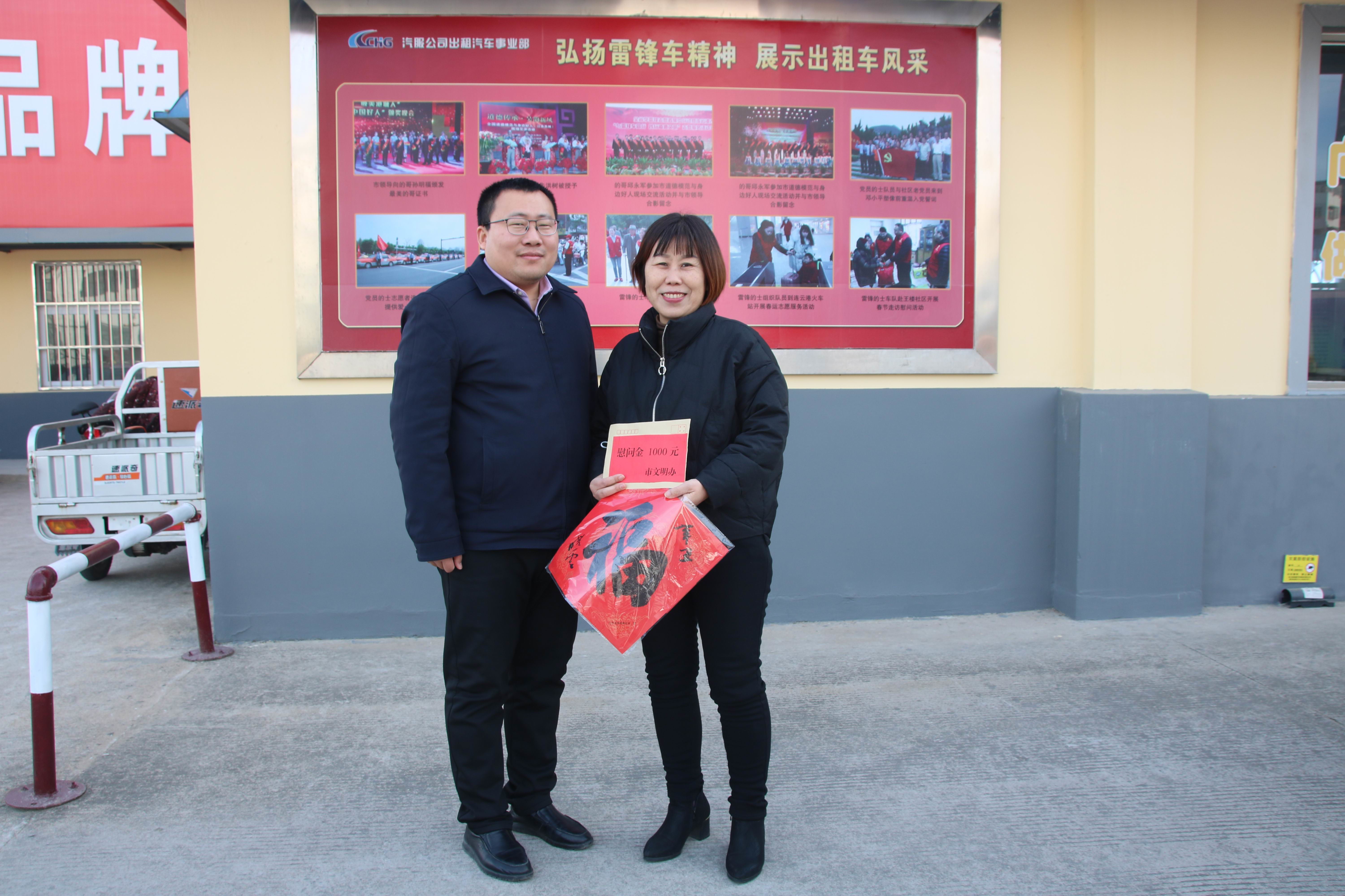 2月8日下午,連云港市委文明辦宣傳部王飛處長專程來到汽服公司出租汽車事業(yè)部看望慰問了市道德模范的姐錢明霞,為錢明霞送上慰問金、并向她致以新年的問候和祝福。