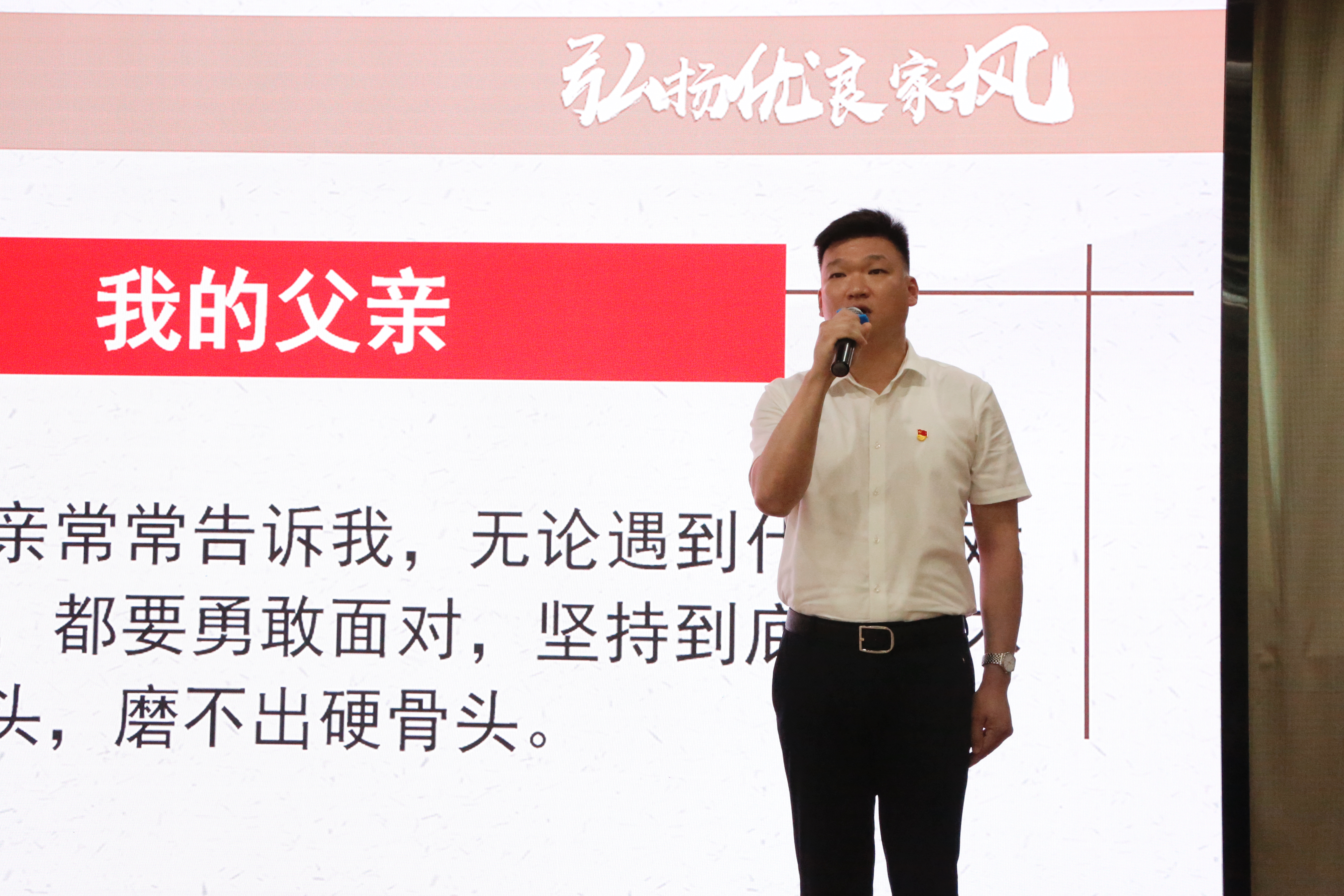 來自汽車公司的宋濤、公交集團的徐辛分別圍繞弘揚優(yōu)良家風主題分享了自己在家風熏陶下的成長經歷,以及如何將家風融入到工作和生活中,實現個人與企業(yè)的共同發(fā)展,這些故事溫馨感人,催人奮進,充滿著對未來的美好期許。通過分享,大家更加深刻地認識到家風對個人、家庭和社會的重要性,也更加堅定了傳承和弘揚優(yōu)良家風的決心。
