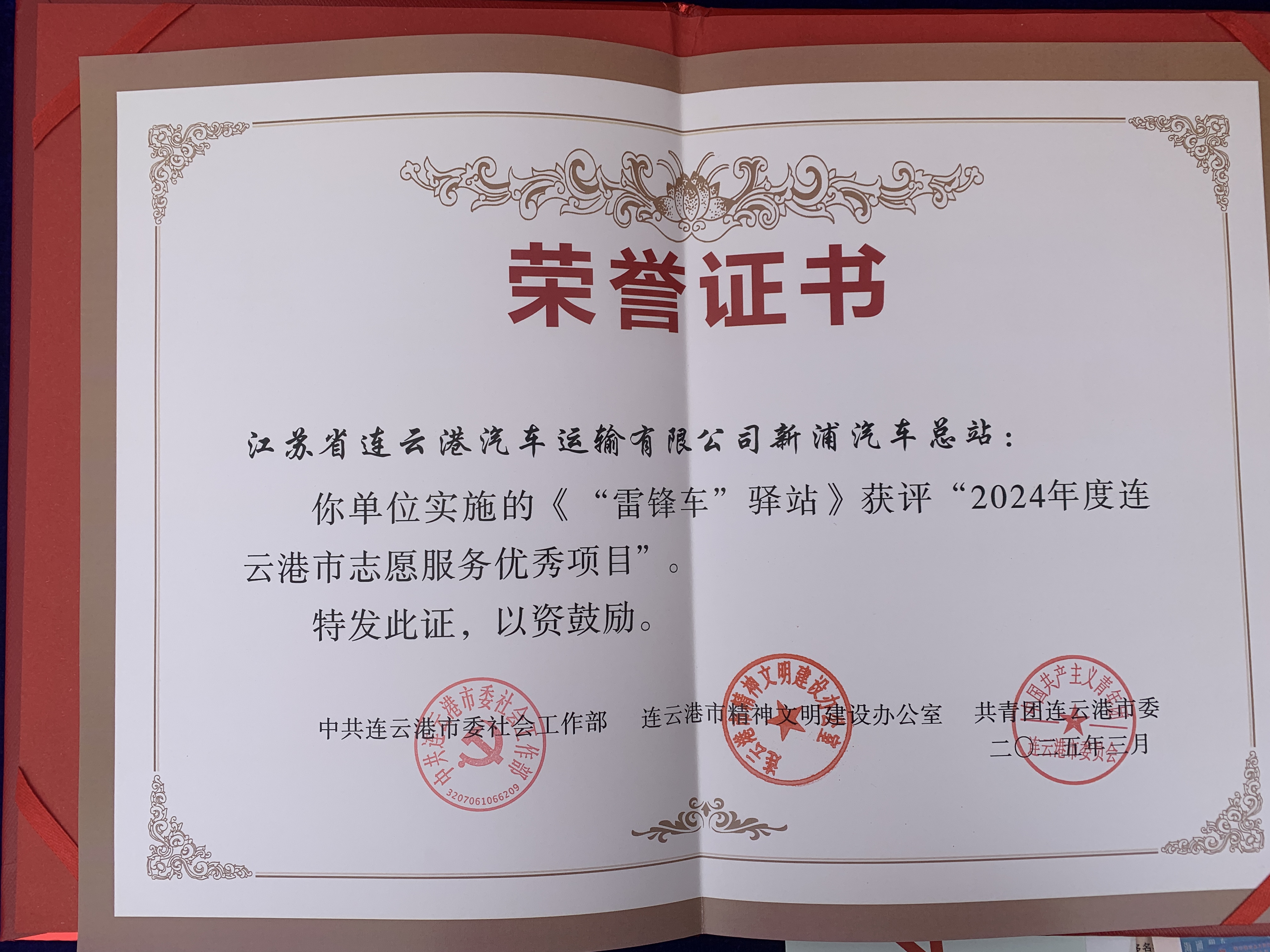 活動現(xiàn)場,新浦汽車總站“雷鋒車”驛站榮獲2024年度連云港市志愿服務優(yōu)秀項目稱號,成為全場矚目的焦點。作為連云港市志愿服務的標桿項目,“雷鋒車”驛站多年來始終堅持“服務群眾、奉獻社會”的宗旨,以實際行動踐行雷鋒精神,贏得了社會各界的廣泛贊譽。