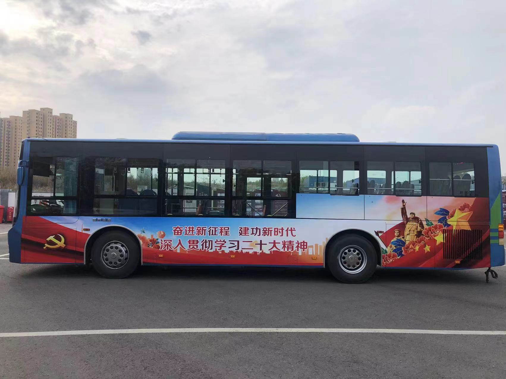 車身外觀,更新為以紅、藍色為主基調(diào),車身噴繪上“深入貫徹學(xué)習(xí)二十大精神”“奮進新征程 建功新時代”等醒目的標(biāo)語,通過車輛每日運行的方式穿梭于城市的大街小巷,增強社會宣傳受眾面,讓黨的理論“坐”上公交,走向社會。