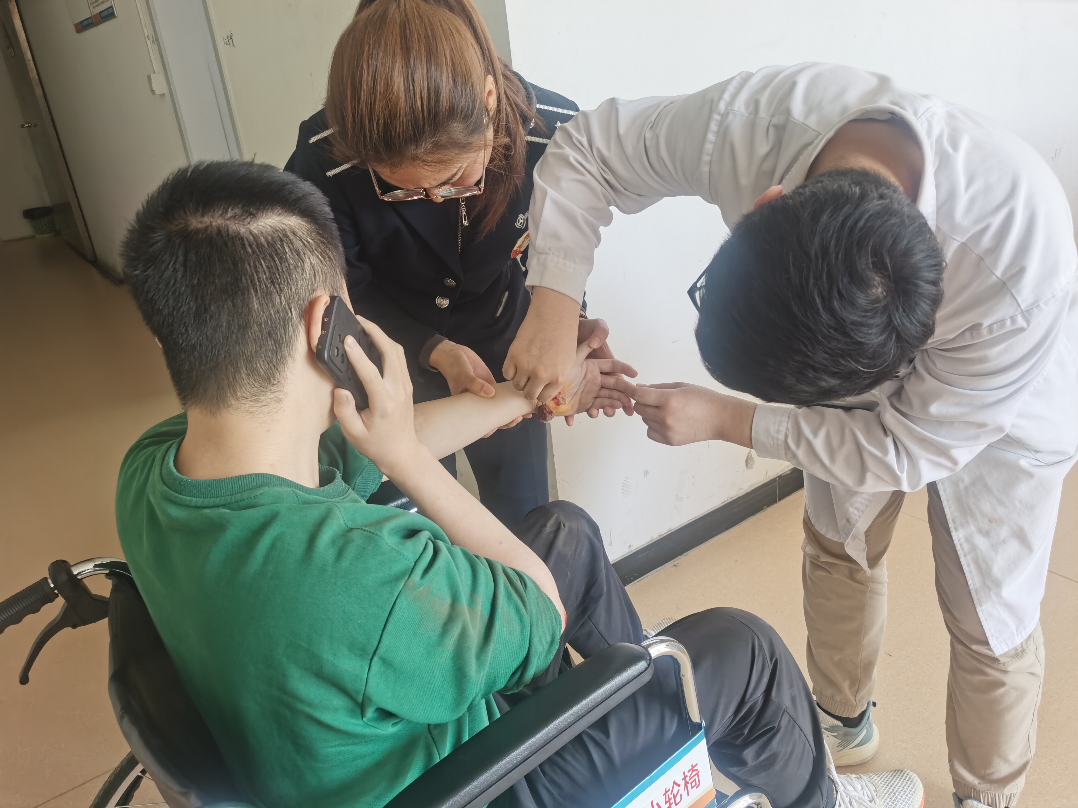 事情發(fā)生在上午8時許,正值“五一”勞動節(jié)運輸高峰期,“雷鋒車”驛站來了一位行走緩慢的男旅客尋求幫助。經(jīng)詢問得知,該旅客姓賀,今年30歲,此次獨自坐高鐵從西安回連云港。由于近期工作比較勞累,今早趕高鐵未用早飯?zhí)幱陴囸I狀態(tài),身體有些不舒服,下臺階時突然眼前一黑,一腳踩空不慎摔傷,兩只胳膊破皮流血并疼痛不止。在詢問賀先生對碘伏等消毒用品無過敏反應后,“雷鋒車”手呂紅和羋丹對他的傷口進行了簡單的清洗、消毒、包扎等應急處理,暫時止住了傷口的出血。但此時羋丹發(fā)現(xiàn)賀先生面色蒼白,左手胳膊無力且疼痛,為了不耽誤治療,在征得賀先生的同意后,羋丹和呂紅立即用輪椅將賀先生送往附近醫(yī)院救治,同時也聯(lián)系了賀先生的家人。