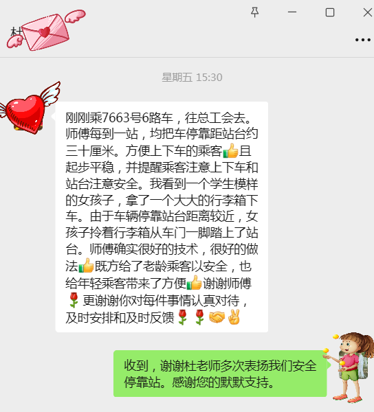 10月24日下午三點(diǎn),市民杜老先生乘坐6路公交車前往市總工會(huì)時(shí),被駕駛員武傳斌的細(xì)心服務(wù)深深打動(dòng)。他特意發(fā)消息至公交集團(tuán)權(quán)屬海通公交公司一名職工的手機(jī)上,稱贊道:“這位師傅開車特別穩(wěn),每到一站都會(huì)將車停得離站臺(tái)特別近,上下車方便又安全!”