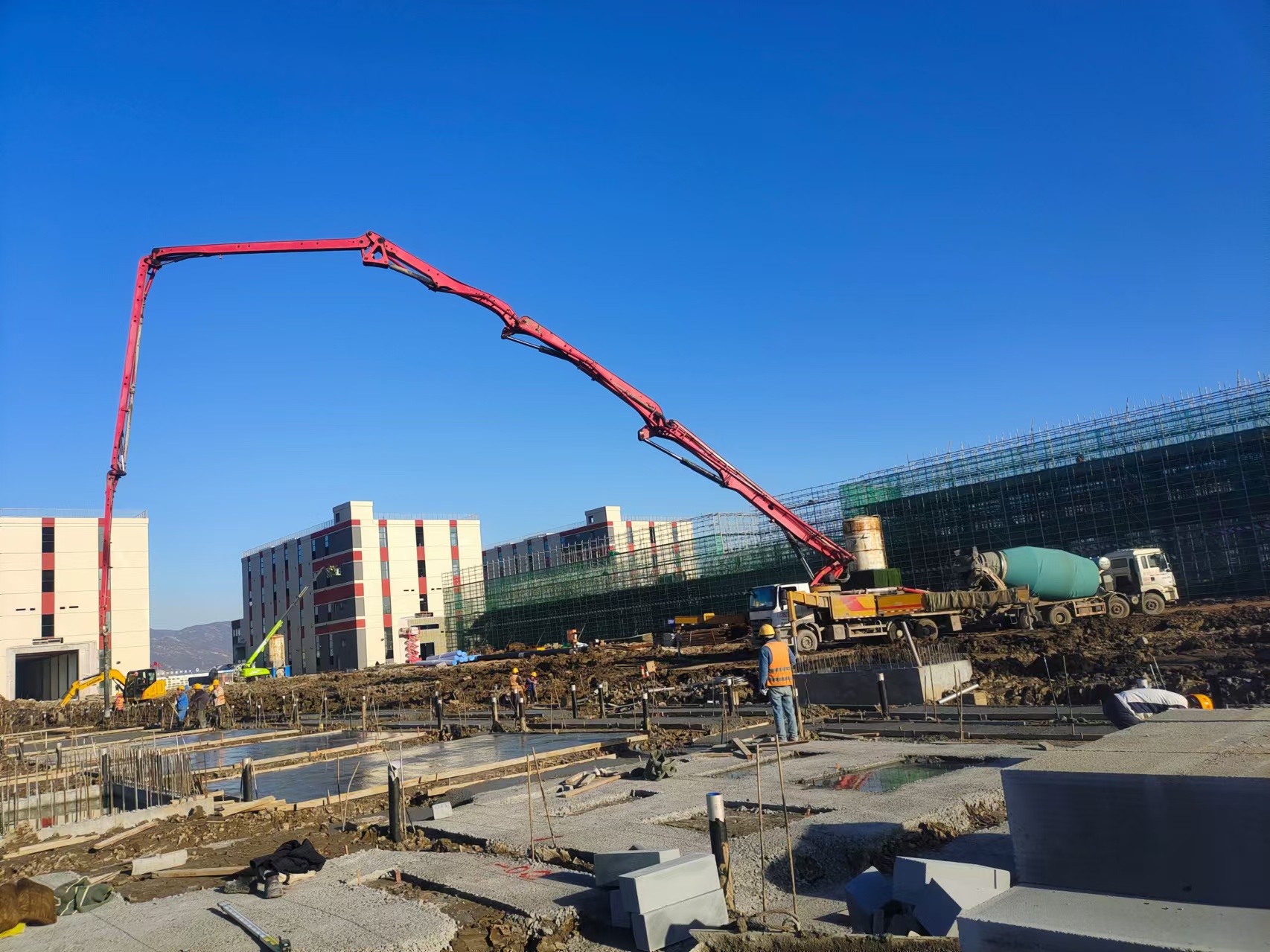 此次混凝土基礎(chǔ)墊層澆筑施工, 是本項目單項工程紡絲車間的關(guān)鍵部分之一,基礎(chǔ)墊層作為建筑物底層的重要組成部分,其質(zhì)量也直接影響到整個結(jié)構(gòu)的安全與穩(wěn)定。為確保本次澆筑順利完成,生產(chǎn)過程中, 基地商混站全體員工齊心協(xié)力、緊密配合,項目團隊不斷優(yōu)化生產(chǎn)方案,落實材料保供,強抓文明生產(chǎn),從原料篩選到攪拌出料,每一個環(huán)節(jié)都嚴格把控,以保障混凝土的高性能和穩(wěn)定性。同時,積極與施工單位協(xié)調(diào), 成功克服現(xiàn)場泵車架設(shè)困難、場內(nèi)道路通行受限等問題,如期完成本次混凝土澆筑任務(wù),為項目后續(xù)施工打下良好基礎(chǔ)。