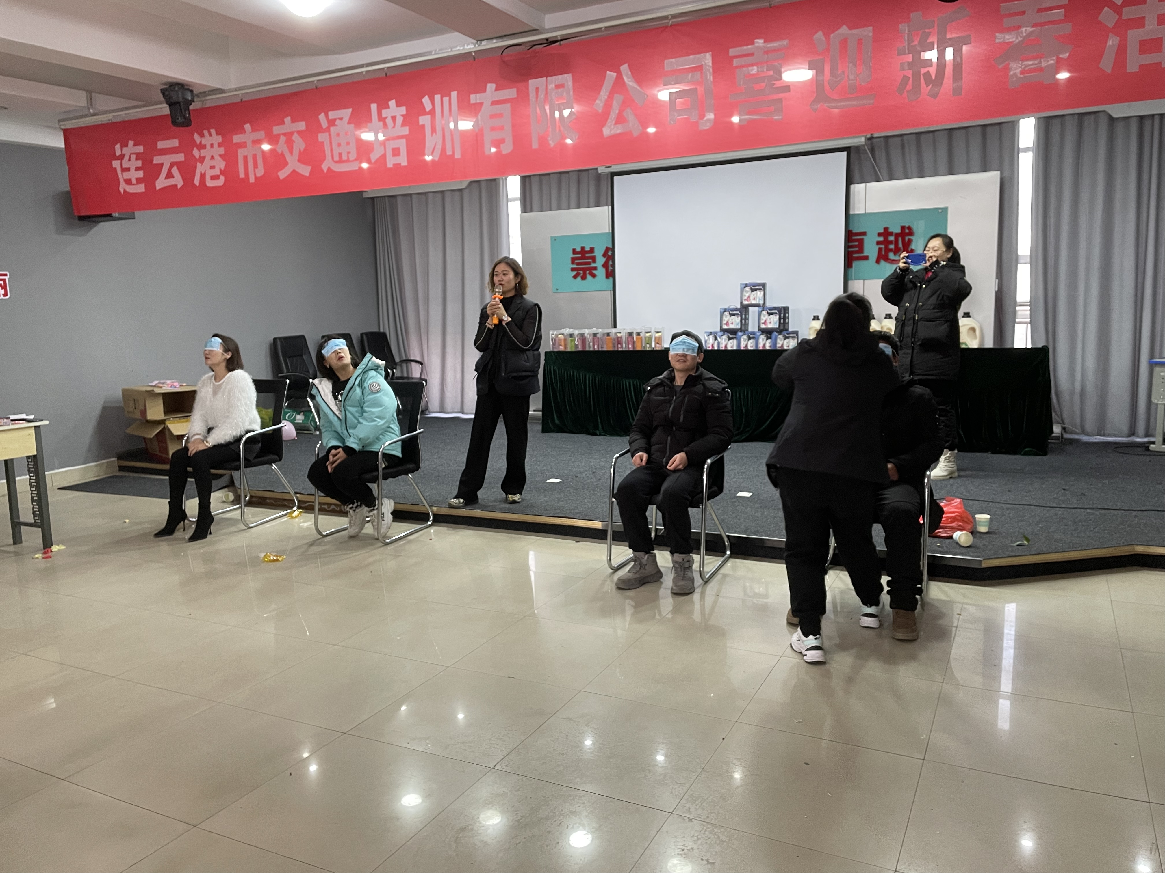 首先進(jìn)行的是“夾紙運杯”。參賽者們需要雙腿夾住一張A4紙,將頭上放置的紙杯中的橘子運送到目的地,運送數(shù)量多的為贏家,主持人宣讀完規(guī)則后,第一組的參賽者們已躍躍欲試,他們每個人充滿信心,以積極飽滿的心態(tài)努力往前沖。觀眾們大聲的呼喊為他們加油;然后進(jìn)行的是“蒙眼吃食物”。大家兩兩組隊,因為喂食物和吃食物的雙方都蒙上了眼睛,只能憑聲音來辨別方位,有的參賽者甚至走到了相反方向,找錯了隊友,“我在這里,快快快”、“劉姐,您在哪,我在最右邊”......大家紛紛用不同方法告訴隊友自己的位置;接著是搶紅包游戲。紅包里有寫有各種各樣的禮品的字條,每輪6人參賽,站在桌子兩邊,主持人會發(fā)出觸碰自己身體不同部位的指令,當(dāng)主持人發(fā)出“紅包”指令,大家需要立刻搶桌上的紅包。大家樂在其中,玩的津津有味。