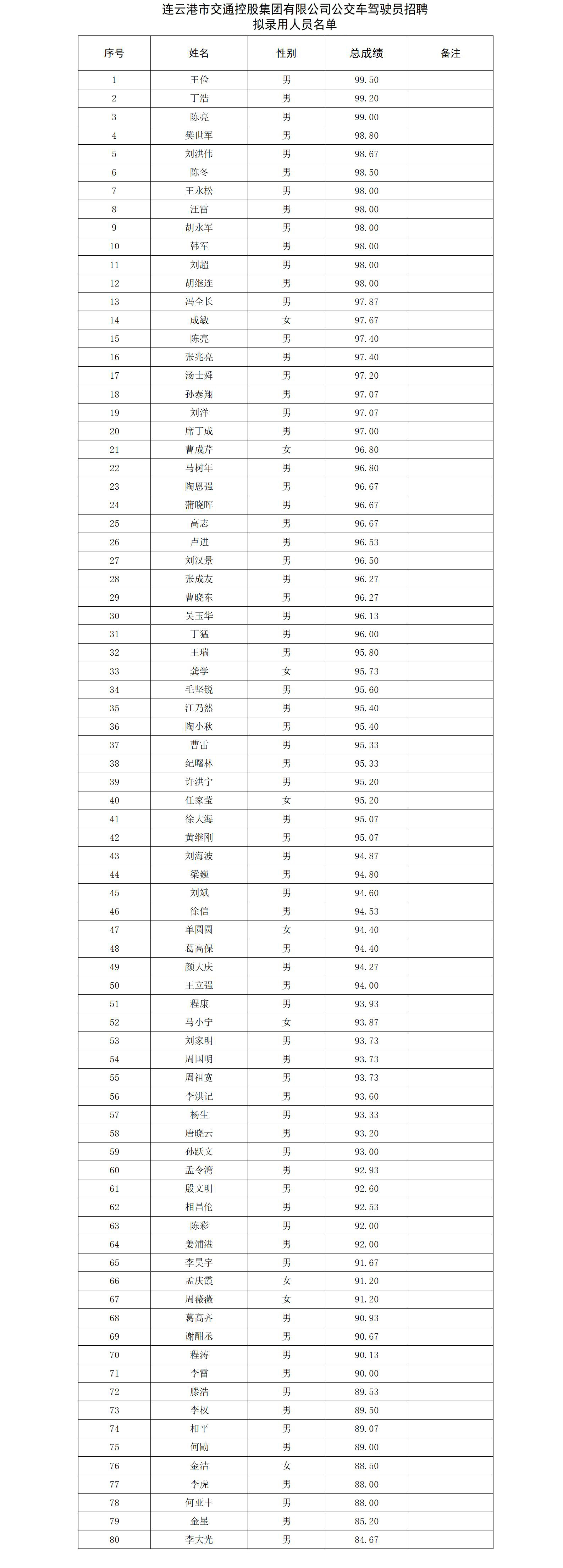根據(jù)連云港市交通控股集團有限公司公交車駕駛員招聘公告有關(guān)規(guī)定和要求,現(xiàn)將本次招聘擬錄用人員名單予以公示。 公示時間:2025年3月21日至3月27日