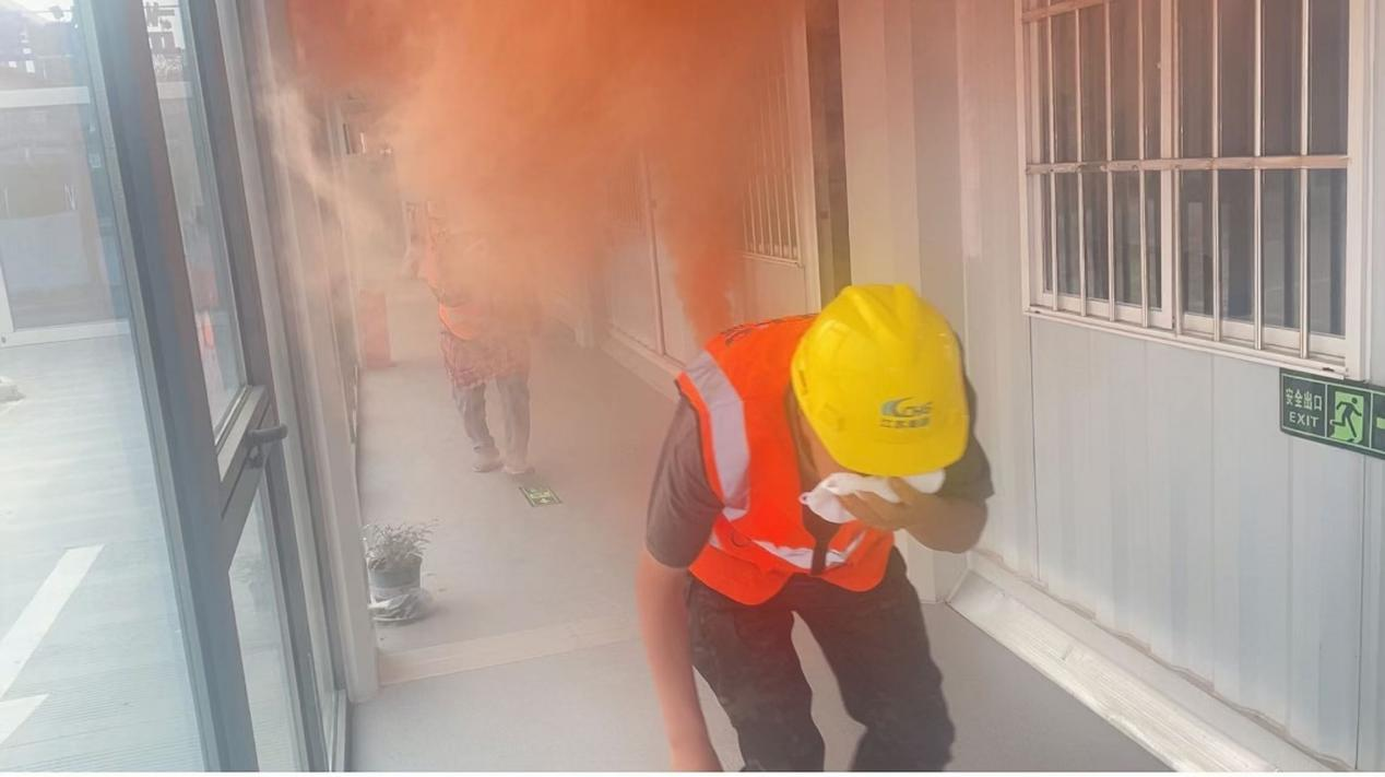 本次演練模擬項目部辦公區(qū)域意外著火的場景。演練現(xiàn)場,濃煙逐漸升起,火勢有迅速蔓延的趨勢。險情出現(xiàn)后,項目負(fù)責(zé)人第一時間拉響警報,應(yīng)急救援小組按照預(yù)案分工進行救援,電工馬上切斷電源;搶險組趕赴火災(zāi)現(xiàn)場,使用消防水帶連接就近的消防栓控制火勢;警戒疏散組拉設(shè)警示帶設(shè)置警示區(qū),指揮現(xiàn)場人員疏散到安全區(qū)并清點人數(shù),禁止無關(guān)人員進入火災(zāi)現(xiàn)場,維持現(xiàn)場的秩序,避免造成混亂。
