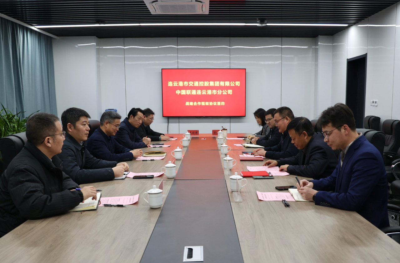 1月25日下午,市交通控股集團(tuán)與中國聯(lián)通連云港分公司舉行簽約儀式。中國聯(lián)通連云港分公司黨委書記宋文豪,副總經(jīng)理張周華等;市交通控股集團(tuán)黨委書記、董事長仲偉濤,副總經(jīng)理王中永等出席簽約儀式。
