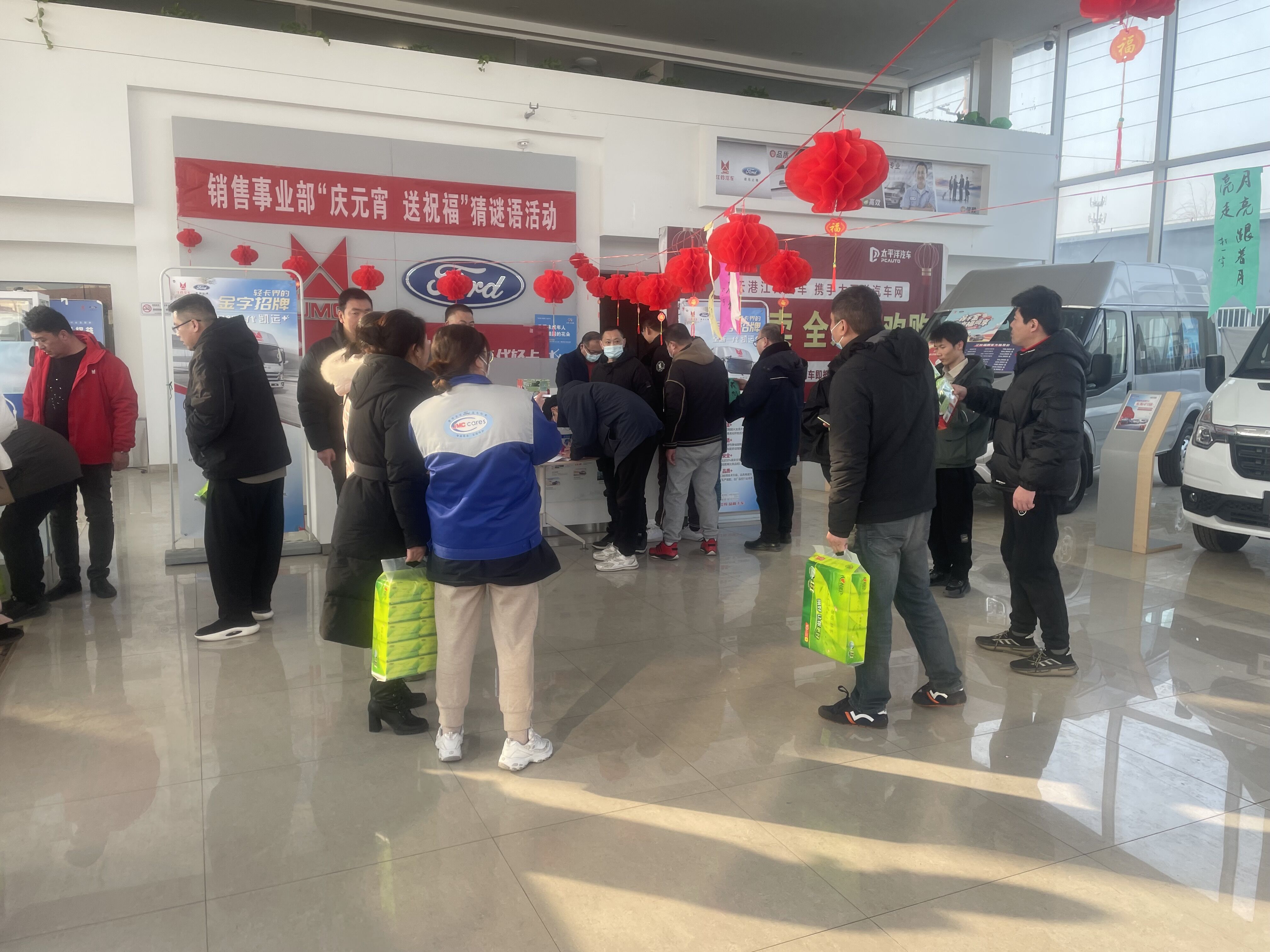 活動開始前,事業(yè)部相關(guān)人員將準(zhǔn)備好的50多個(gè)紅燈籠高高懸掛在江鈴福特銷售展廳的繩子上,營造出濃厚的節(jié)日氛圍。明亮的大廳里,在四周懸掛的一個(gè)個(gè)紅燈籠下面,系著五顏六色的燈謎卡,燈謎內(nèi)容隱藏著關(guān)于中國傳統(tǒng)節(jié)日、中國地名、汽車品牌等各種知識。前來挑戰(zhàn)的干部職工們各個(gè)躍躍欲試、冥思苦想、互相交流,一旦想出答案,立刻興奮地跳起身來摘下謎面去找工作人員核對,歡歡喜喜地領(lǐng)取一份節(jié)日小禮品。整個(gè)現(xiàn)場熱鬧非凡,歡呼聲此起彼伏,燈籠下面的謎面卡,不一會兒就被摘搶一空。