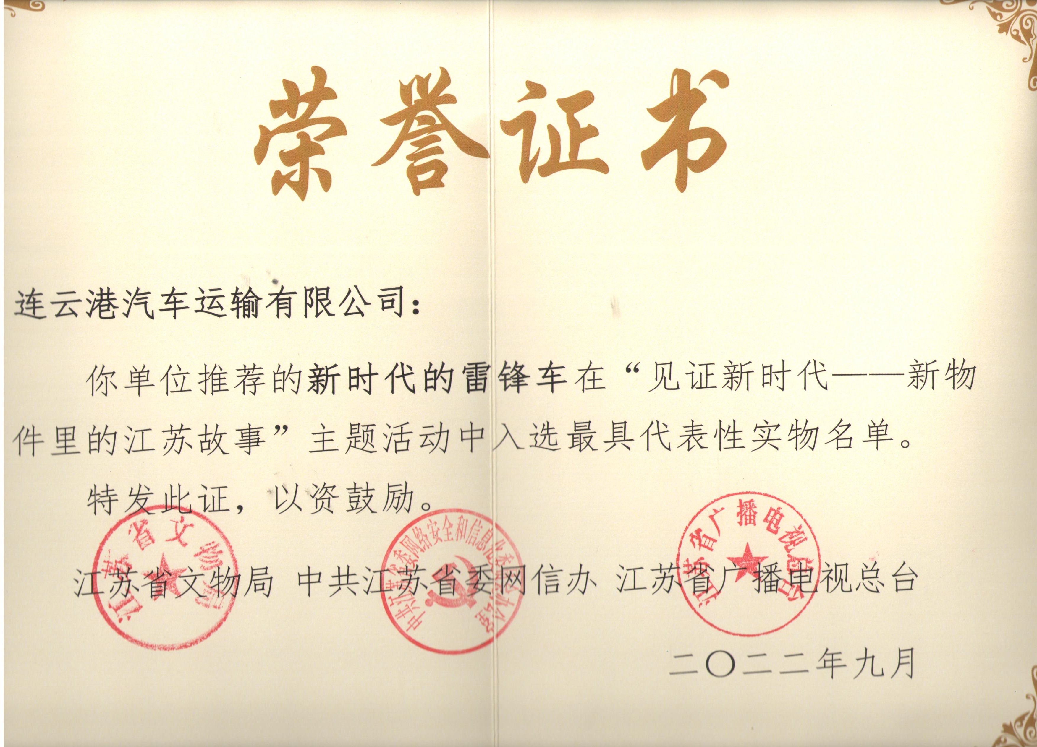 為營造全社會共同守護革命文物、傳承紅色基因、賡續(xù)紅色血脈、弘揚革命精神的良好氛圍,“革命文物看江蘇”融媒體傳播集中展示活動于9月27日在南京博物院小劇場舉行,汽車公司“新時代的雷鋒車”入選“見證新時代——新物件里的江蘇故事”最具代表性實物名單。