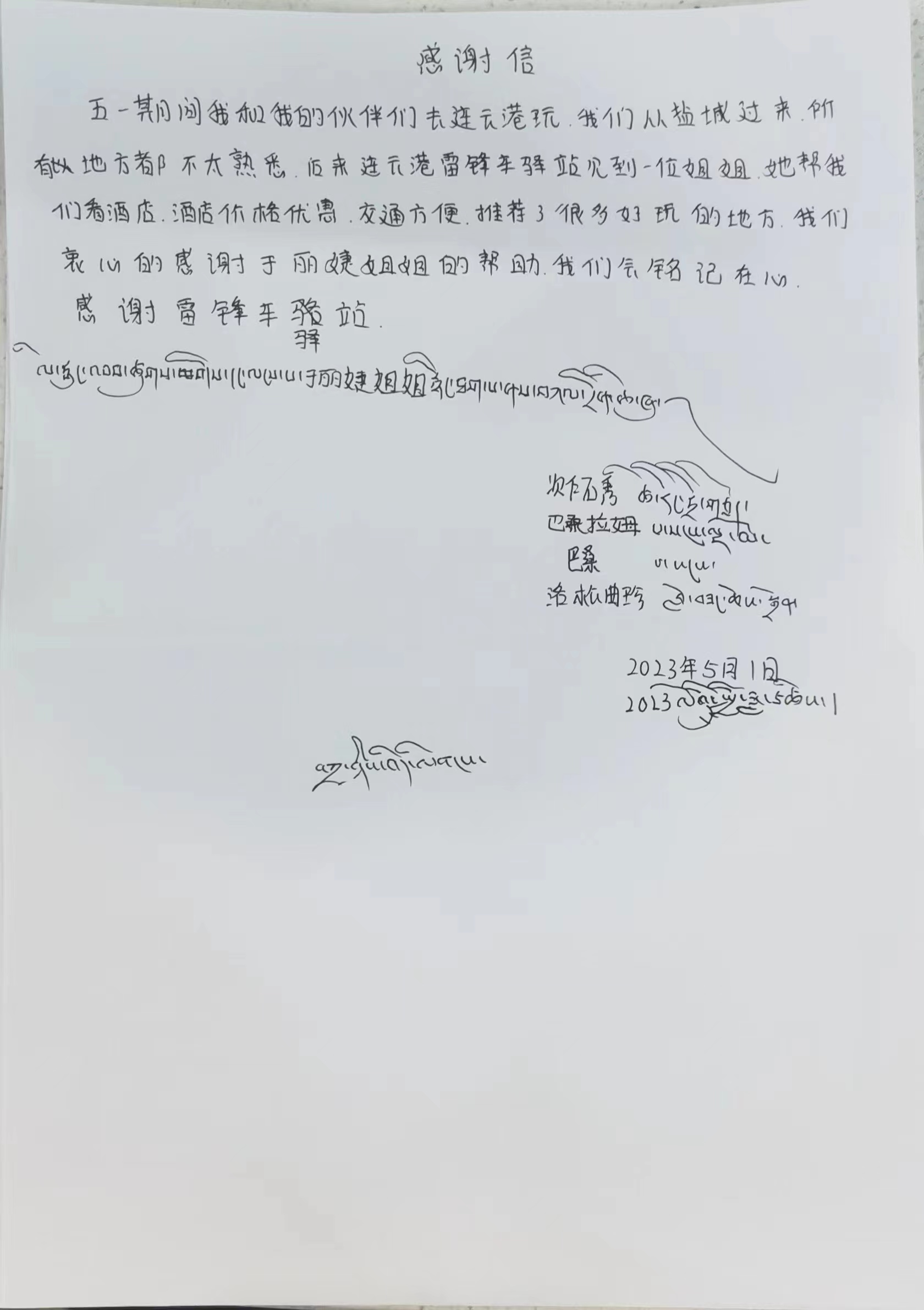 5月1日,連汽“雷鋒車”驛站收到了一封手寫的感謝信。寫感謝信的是四位外地來連游玩的大學(xué)生,她們在信中對“雷鋒車”驛站的志愿者于麗捷熱情、友愛、助人的工作作風(fēng)深表謝意。感激之余,四位大學(xué)生寫下了這樣一封感謝信。