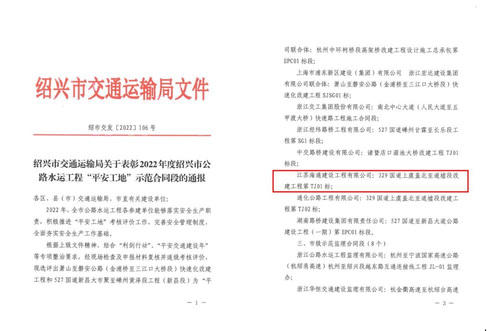 近日,從紹興市交通運(yùn)輸局處獲訊,由江蘇海建公司承建的329國道上虞蓋北至道墟段改建工程第TJ01標(biāo)榮獲紹興市市級示范“平安工地”稱號。