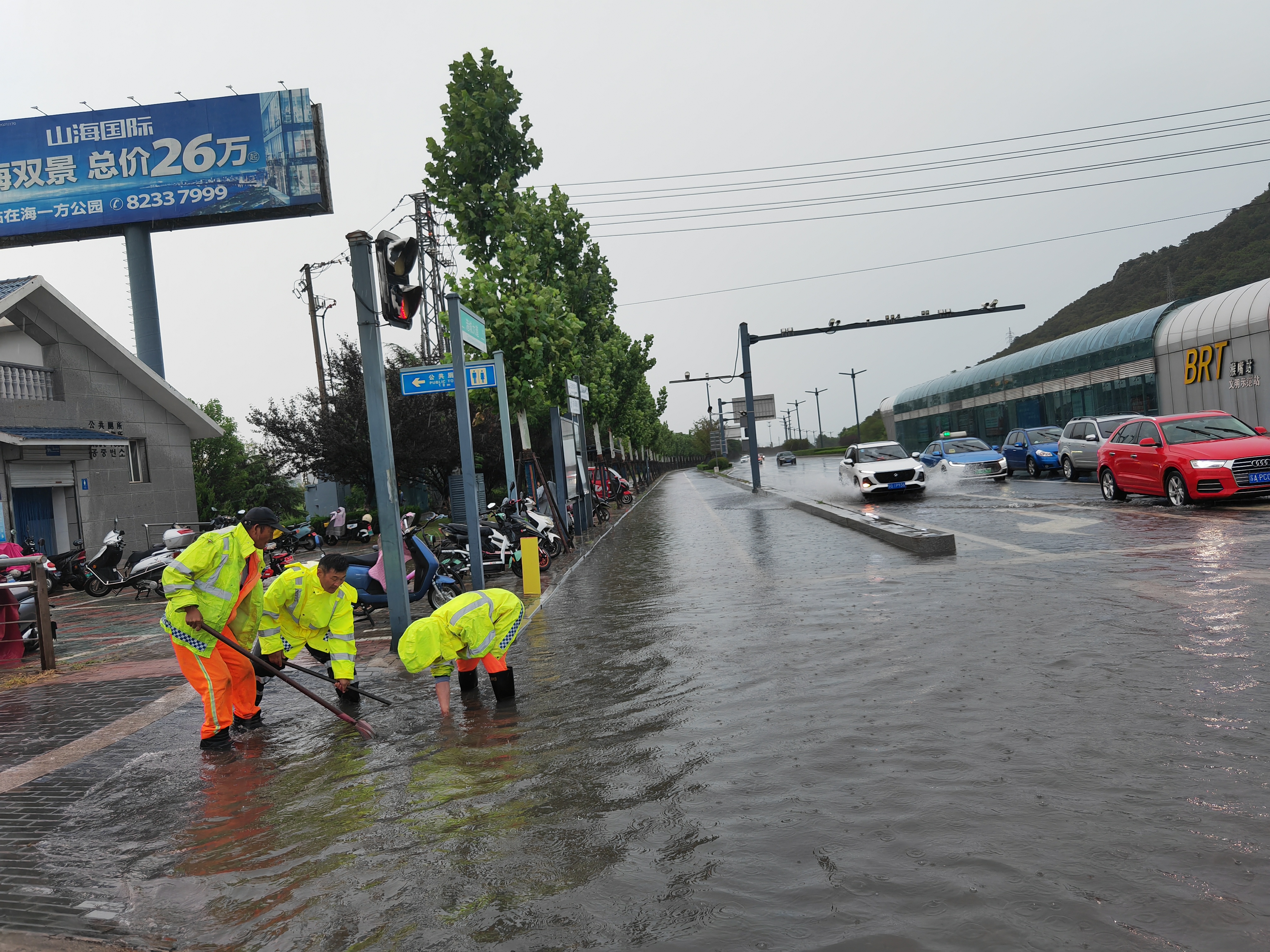臺風來臨前,豐達公司對管養(yǎng)路段進行全面隱患排查,重點檢查排水系統(tǒng)、泵站運行及施工現(xiàn)場安全,并提前調(diào)配應(yīng)急物資和設(shè)備。暴雨來襲后,公司立即按照預案要求,組織150余名應(yīng)急搶險隊員、14臺應(yīng)急車輛、3套發(fā)電機組、8臺污水泵及800米水帶等搶險力量,迅速開展道路巡查和險情處置工作。