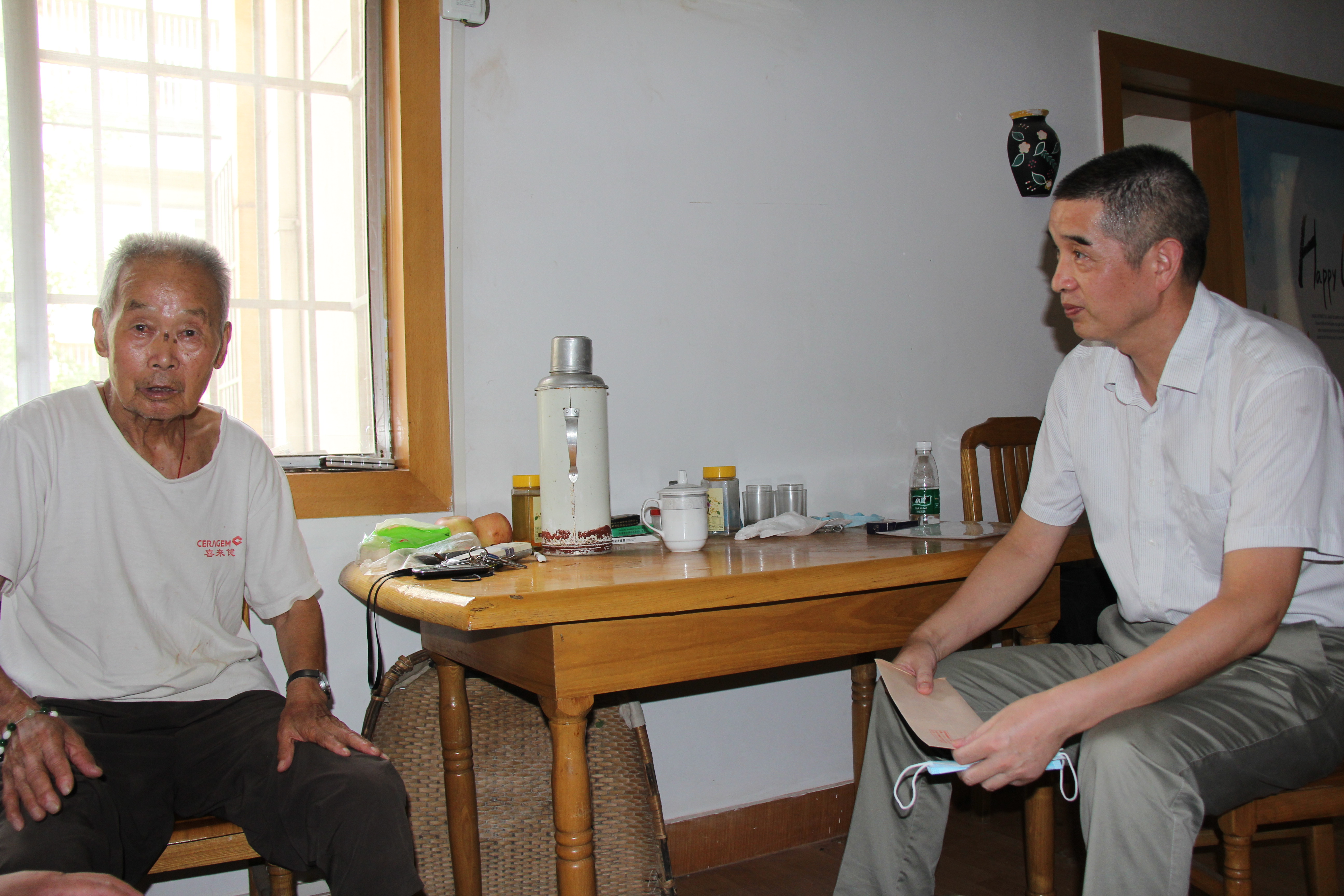 來到周老家,周老及其家人對來訪人員分外熱情,周老讓大家坐下,吩咐家人沏茶。在交談中,了解到周老已經(jīng)92歲的高齡了,曾是廣州0239部隊營參謀長,參加過許許多多大大小小的戰(zhàn)役,經(jīng)歷很多生死離別,大家對周老的崇敬之情油然而生。寧宇詢問老人身體健康、飲食起居情況,感恩他為祖國、為企業(yè)作出的巨大貢獻。寧宇還向周老送上了慰問金,叮囑老人家要保重身體,祝福他身體健康,安享晚年。