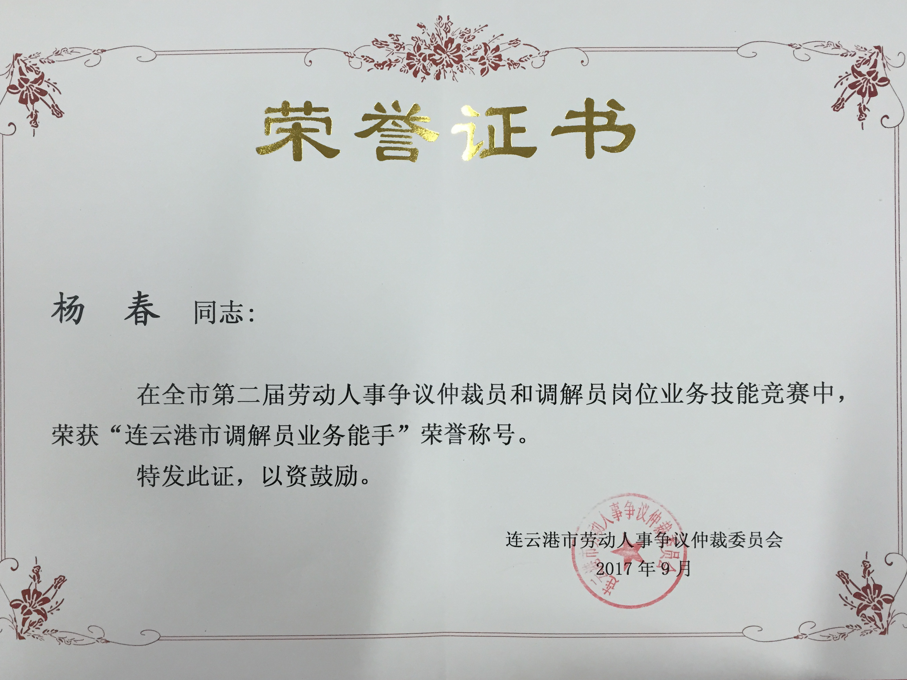 9月,航運公司楊春同志在連云港市第二屆勞動人事爭議仲裁員和調(diào)解員崗位業(yè)務(wù)技能競賽中獲得“連云港市調(diào)解員業(yè)務(wù)能手”榮譽稱號。該項技能競賽由市人力資源和社會保障局、市總工會、市勞動人事爭議仲裁委員會共同組織舉辦,共50多名選手參加第二屆勞動人事爭議仲裁員和調(diào)解員崗位業(yè)務(wù)技能競賽。經(jīng)過筆試和面試的綜合成績評選,前十名的仲裁員和調(diào)解員獲得榮譽證書。競賽以促進我市和諧勞動關(guān)系的構(gòu)建為出發(fā)點,鼓勵廣大人力資源工作從業(yè)者、工會工作者,積極主動學習相關(guān)勞動法律法規(guī),不斷提高職業(yè)素養(yǎng)和業(yè)務(wù)水平。
