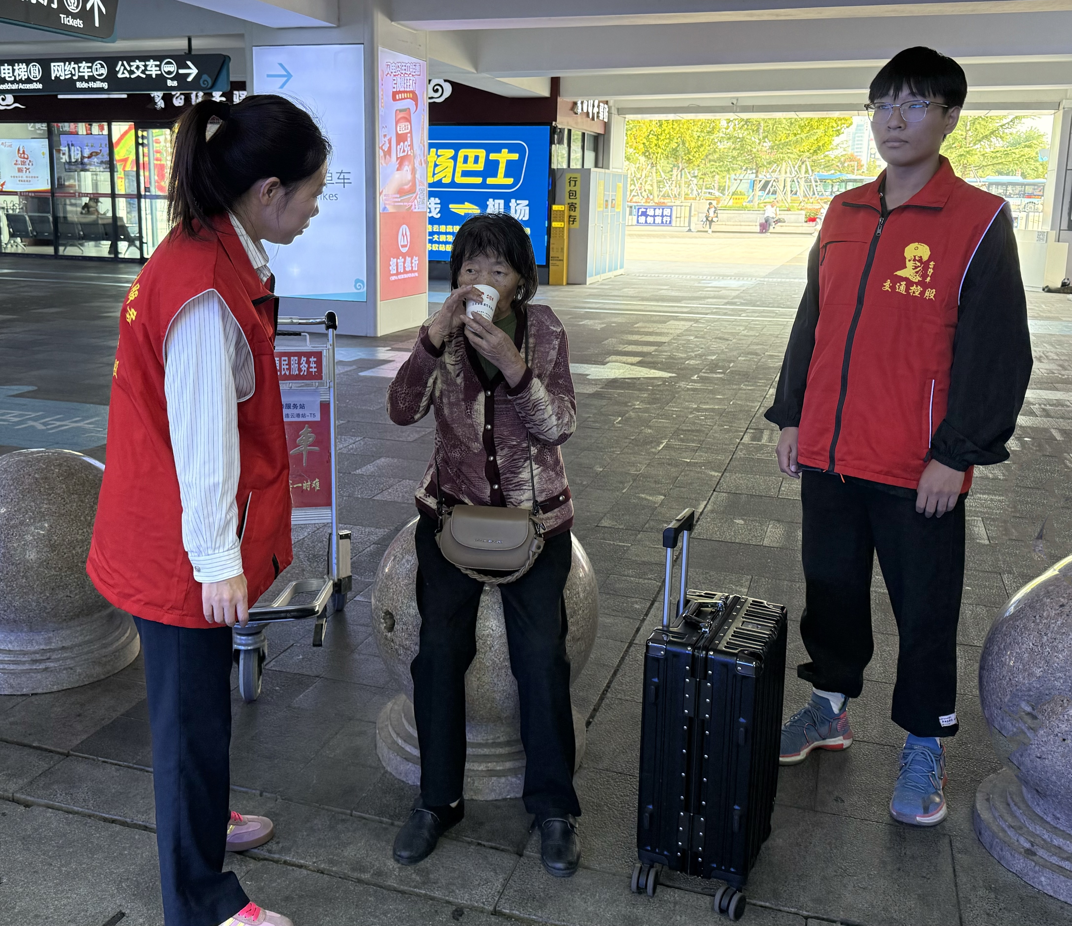 當(dāng)天,老人姐妹倆抵達(dá)連云港高鐵站后,因旅途勞頓,姐姐的身體狀況愈發(fā)虛弱,手不停地發(fā)抖。這一幕恰好被正在做志愿服務(wù)的“雷鋒車”手和志愿者們看到。他們迅速上前詢問情況,并立即為老人提供了熱水,以緩解她的不適。