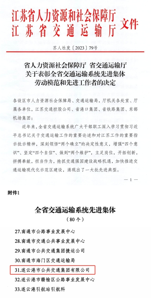 近日,公交集團(tuán)被省人力資源社會(huì)保障廳、省交通運(yùn)輸廳授予“全省交通運(yùn)輸系統(tǒng)先進(jìn)集體”榮譽(yù)稱號(hào)。