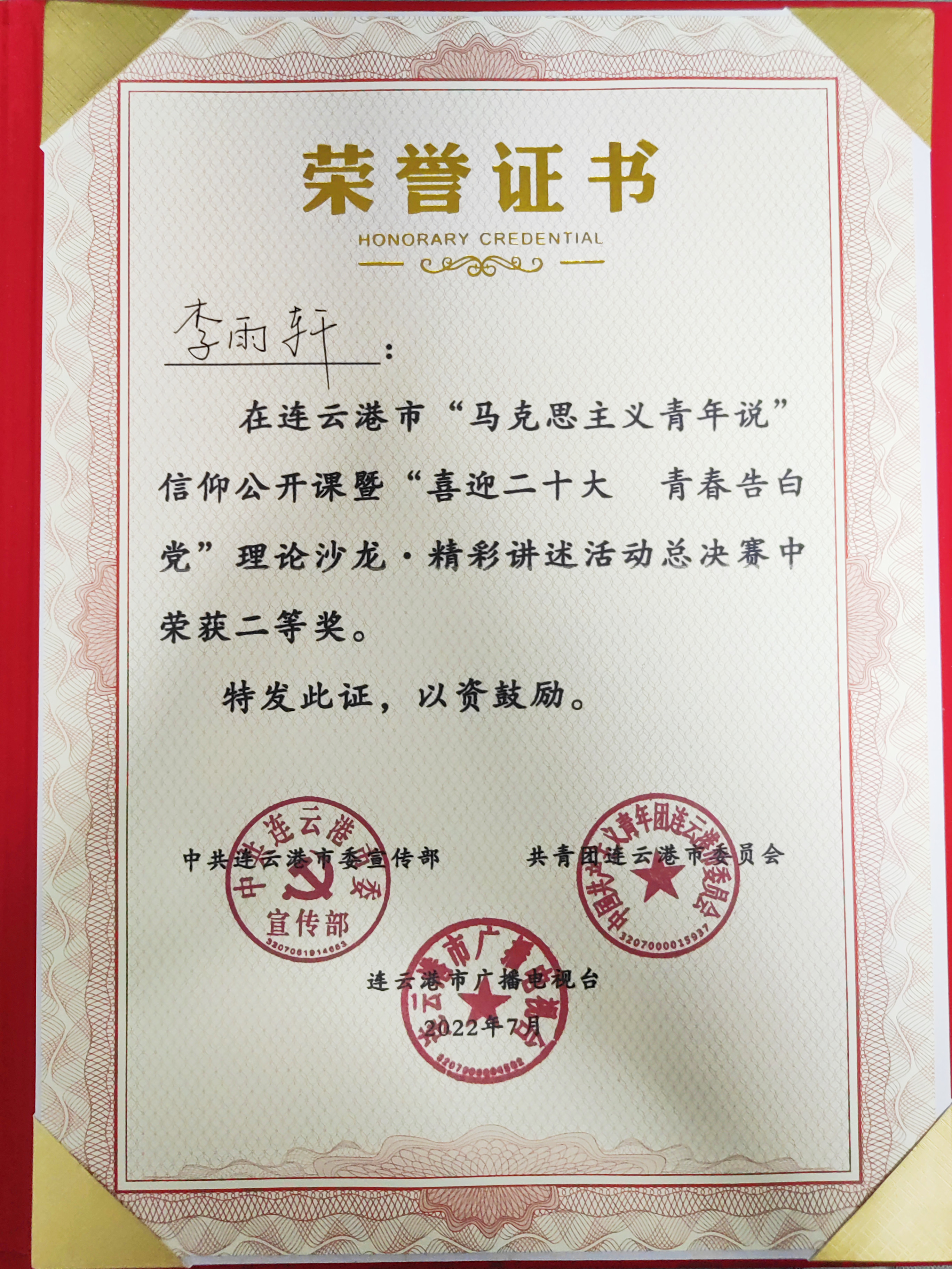 為深入學(xué)習宣傳貫徹習近平新時代中國特色社會主義思想和黨的十九屆會議系列精神,不斷推進馬克思主義中國化、時代化、大眾化,以實際行動迎接黨的二十大勝利召開,7月27日,由市委宣傳部、團市委、市廣播電臺聯(lián)合舉辦的全市“馬克思主義青年說”信仰公開課暨“喜迎二十大 青春告白黨”理論沙龍?精彩講述活動總決賽在市廣播電臺舉行。連汽新浦汽車站總站“雷鋒車”手李雨軒在此次比賽中榮獲二等獎。