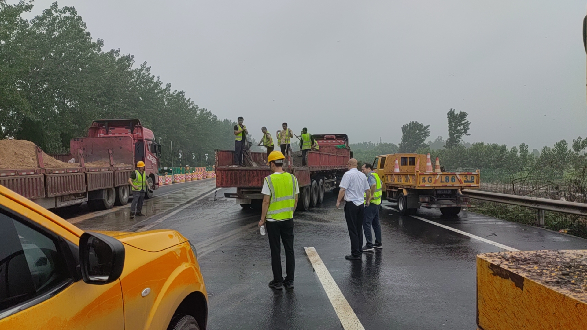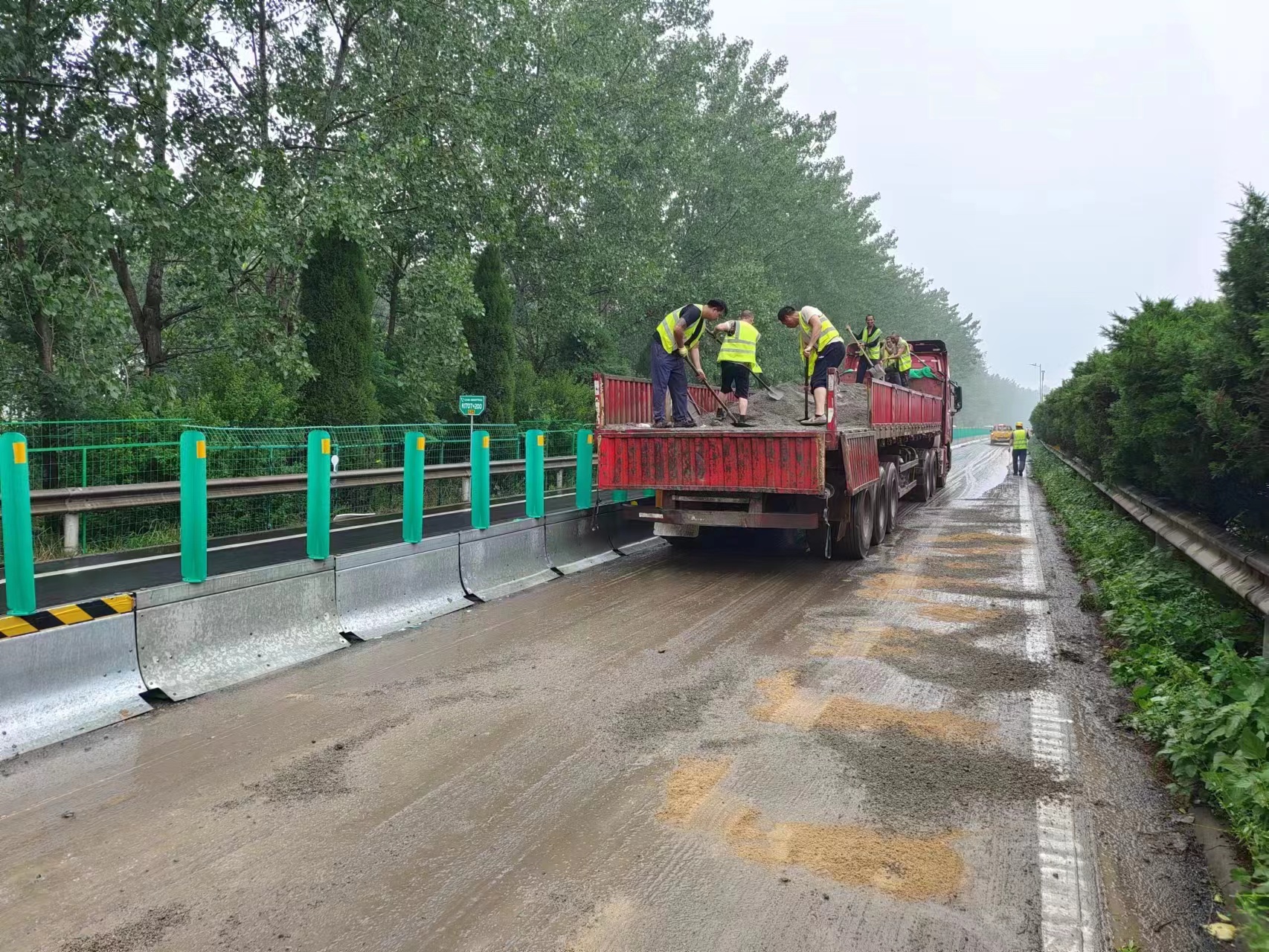 豐達公司寧連高速D標項目部接到上級電話通知,立即組織應(yīng)急處置人員與車輛第一時間到達現(xiàn)場清理。項目部組織應(yīng)急隊伍32人,工程車輛12輛趕赴現(xiàn)場,迅速開展現(xiàn)場清理、沙石吸附、清掃推灰。直至10:26分,經(jīng)施工人員多方努力,路面油污終于清理干凈,受污染路面消除了安全隱患,道路恢復了暢通。