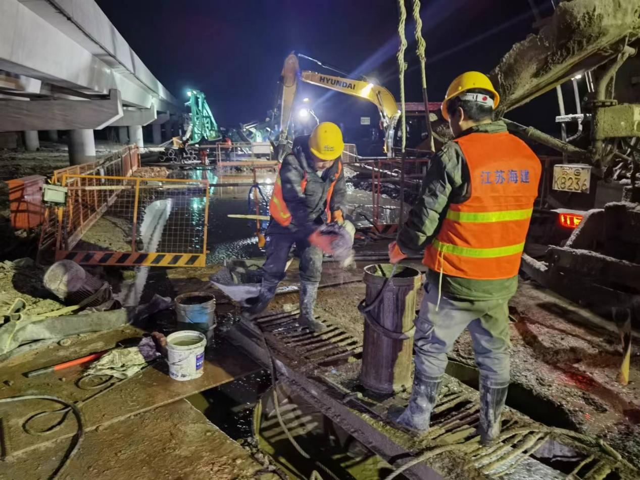 此次澆筑工作由江蘇海建港通分公司的專業(yè)團(tuán)隊負(fù)責(zé),面對復(fù)雜的地質(zhì)條件和夜間施工的挑戰(zhàn),施工團(tuán)隊精心籌備,嚴(yán)格把控每一個施工環(huán)節(jié)。從鉆孔定位到鋼筋籠下放,再到混凝土澆筑,每一道工序都經(jīng)過反復(fù)的技術(shù)交底和質(zhì)量檢查,確保施工安全和工程質(zhì)量。為保障夜間施工順利進(jìn)行,現(xiàn)場配備充足的照明設(shè)備和安全警示標(biāo)識,施工人員輪流作業(yè),技術(shù)人員全程監(jiān)督,及時解決施工中出現(xiàn)的問題。經(jīng)過3個小時的奮戰(zhàn),首根灌注樁成功澆筑完成,樁長37.7米,樁徑1.6米,各項指標(biāo)均符合設(shè)計要求。