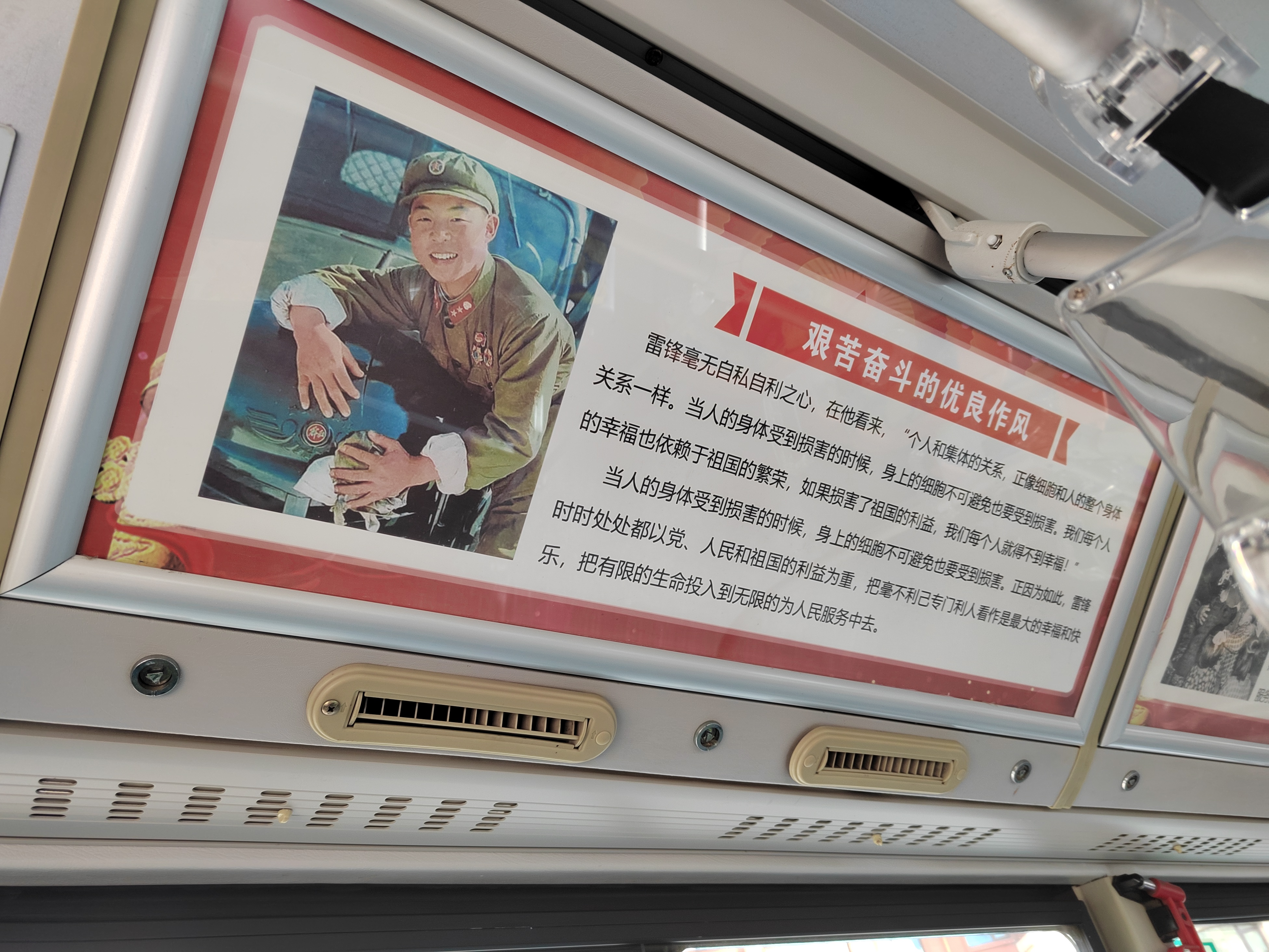 31路公交線全程22個站點,途經(jīng)連云區(qū)主城區(qū)、海濱大道,道路情況復雜,上下坡道較多,乘客大多數(shù)為海濱大道周邊及連云古鎮(zhèn)居住的老年人。第60個學雷鋒紀念日即將到來,公交集團公交事業(yè)二部精心裝扮31路蘇GK8832公交車學雷鋒主題公交車。車廂外部以“學習雷鋒精神 弘揚雷鋒精神 爭做時代先鋒”為主題詞;車廂內部從“共產(chǎn)主義戰(zhàn)士 最美奮斗者”“艱苦奮斗的優(yōu)良作風”“刻苦學習和鉆研理論”“干一行愛一行鉆一行”四大方面宣傳、介紹雷鋒先進事跡,弘揚雷鋒精神。乘客進站臺前,便能遠遠地感受到濃厚的學雷鋒氛圍,感受到31路“與雷鋒車同行海濱大道文明線”車廂里積極向上的紅色底色。